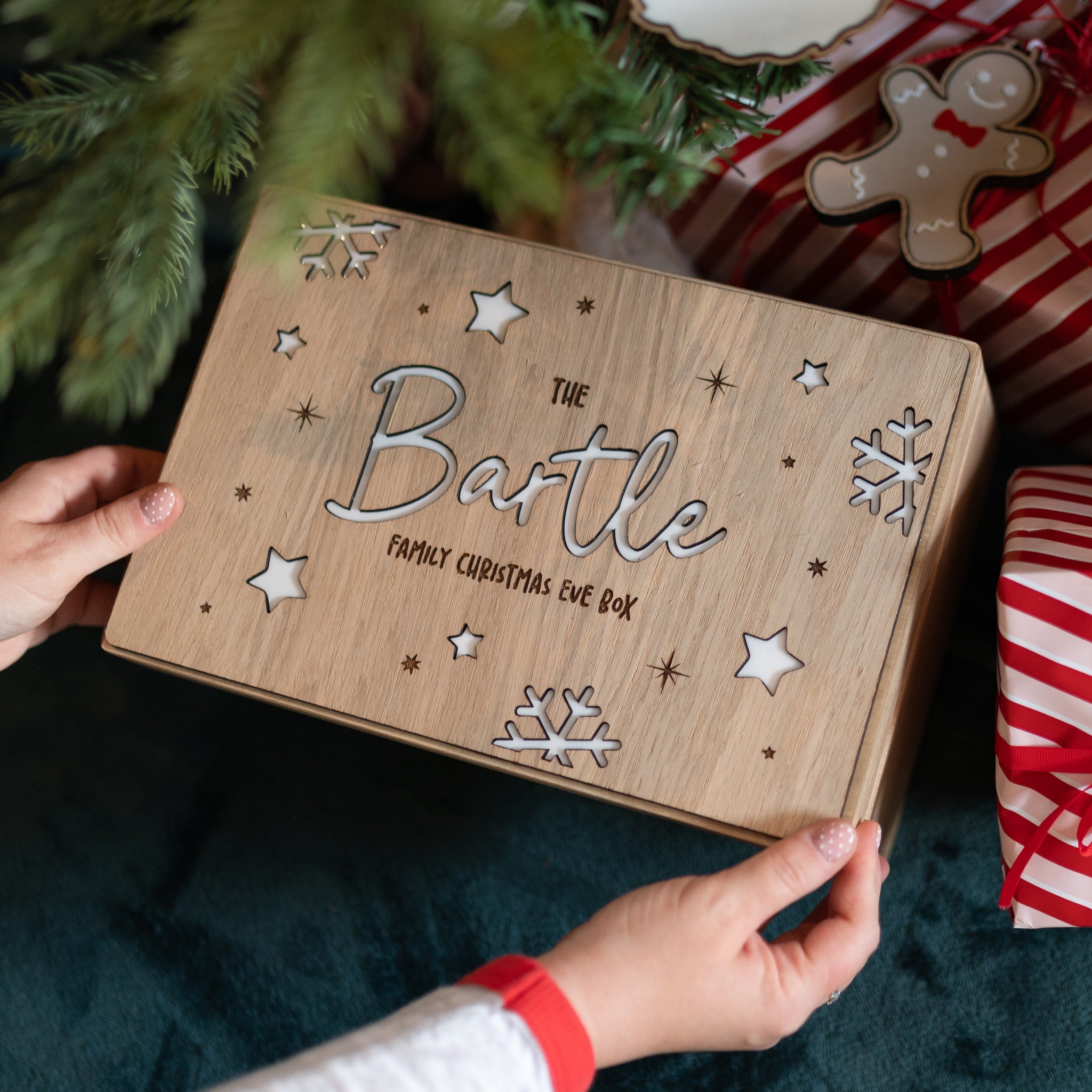 Introducing our Personalised Family Christmas Eve Box – the perfect festive addition to your family's christmas traditions! Crafted from high-quality wood and beautifully engraved with delicate snowflakes and stars, this sturdy box is designed to store all your family’s Christmas Eve essentials, from cozy pyjamas to hot cocoa and festive treats.